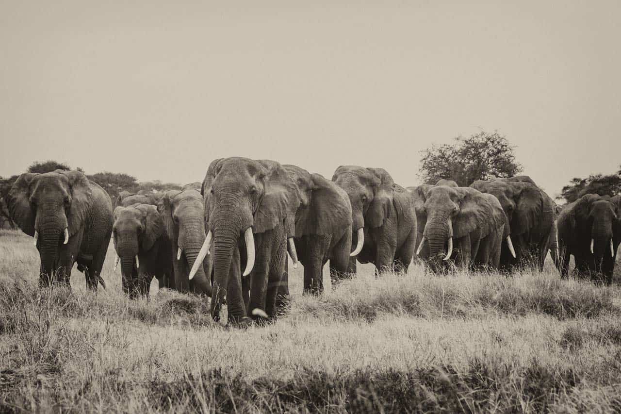 A quelques mètres à peine, des girafes mâchent patiemment des feuilles d’acacias en nous regardant de leurs grands yeux ourlés de longs cils. A quelques distances un troupeau d’éléphants passe, majestueux, en direction de la rivière.