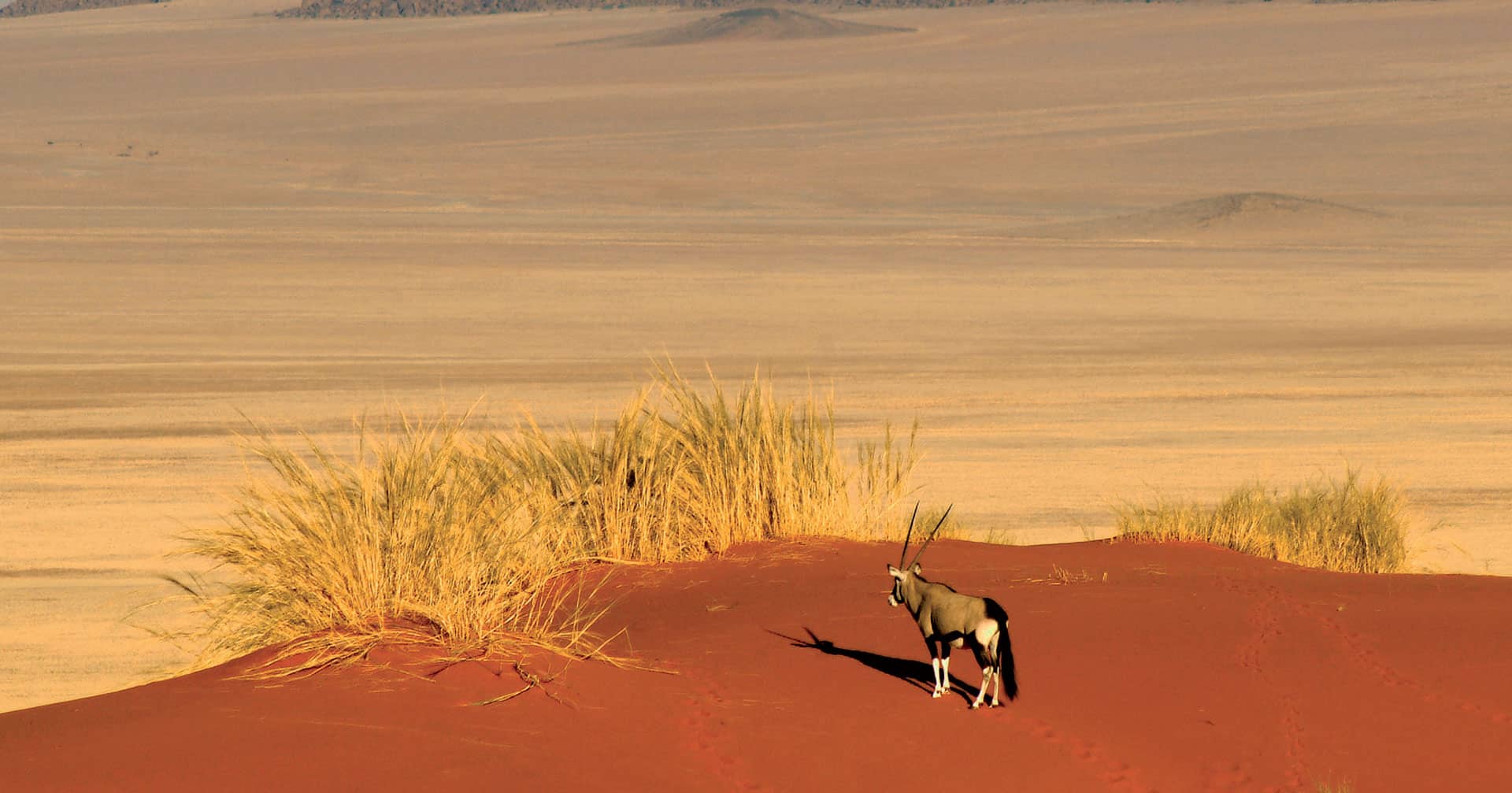 Après le petit déjeuner, départ pour le désert du Namib (3h00 de route). Traversée de zones semi-désertiques, rocailleuses, parsemées d’immenses Kopjes et alternant avec des paysages montagneux.