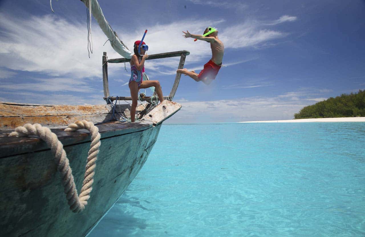 Hébergement en face de l’atoll de Mnemba au Sunshine Marine Lodge ou au White Sand Luxury Villa & Spa en demi-pension.