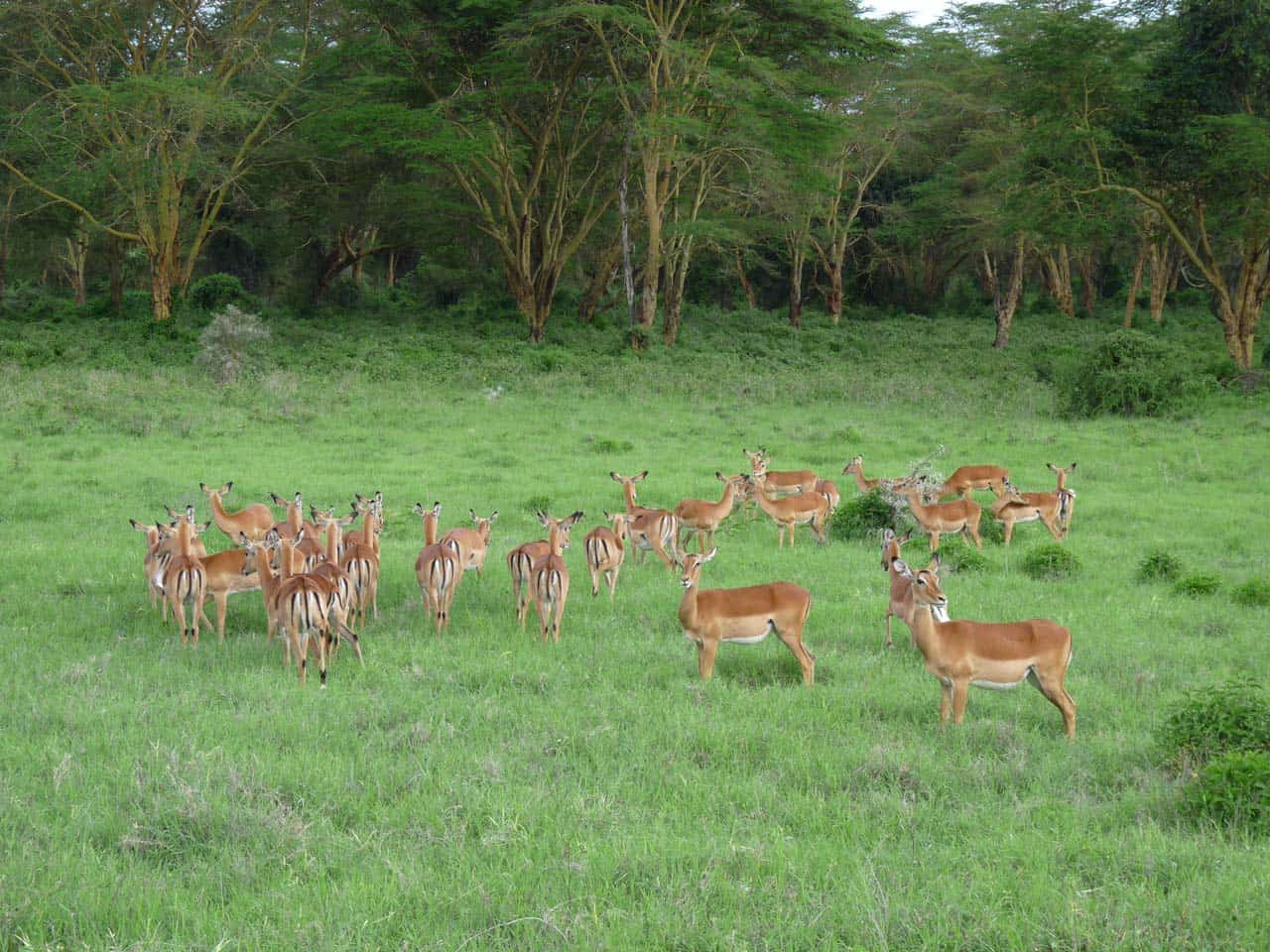 En fonction des saisons et des niveaux d’étiage, ces colonies de flamants et de pélicans se déplacent de lacs en lacs et notamment vers Bogoria et Elmenteita qui sont aussi des lacs d’eau saumâtre. A une altitude de 1.758 M, le parc national du lac Nakuru s’étend sur 188 KM carrés et sur 25 KM de longueur du Nord au Sud.