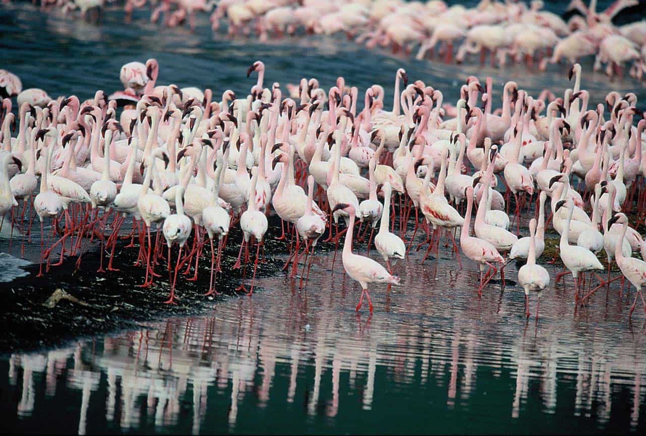 Rares sont les animaux qui comme eux, supportent la causticité de son eau, proche de celle de l’ammoniac. Par conséquent, personne ne peut s’y baigner. Les flamants roses ont donc peu de prédateurs, car, après une première barrière formée par la boue, ceux qui s’aventureraient dans le lac risqueraient la calcification. Lorsqu’il s’est rendu sur ses rives, le célèbre photographe animalier Nick Brandt a dû se rendre à l’évidence : il existe, en Afrique, un lac qui transforme les animaux en statue de pierre. Les femmes masaïs, drapées dans le shuka, le tissu rouge ou bleu de leur tenue traditionnelle, récoltent le sel et en font des plaques qu’elles revendent sur les bords des pistes. Un survol en avion, peut être fascinant, car en plus des taches roses des colonies de flamants, on peut observer des concrétions minérales rouges dans le lac. Attention, les abords sont dangereux en voiture du fait de la boue et de la croute asséchée et superficielle qui peut s’effondrer. Il est préférable d’y accéder à pied guidé par un masaÏ.