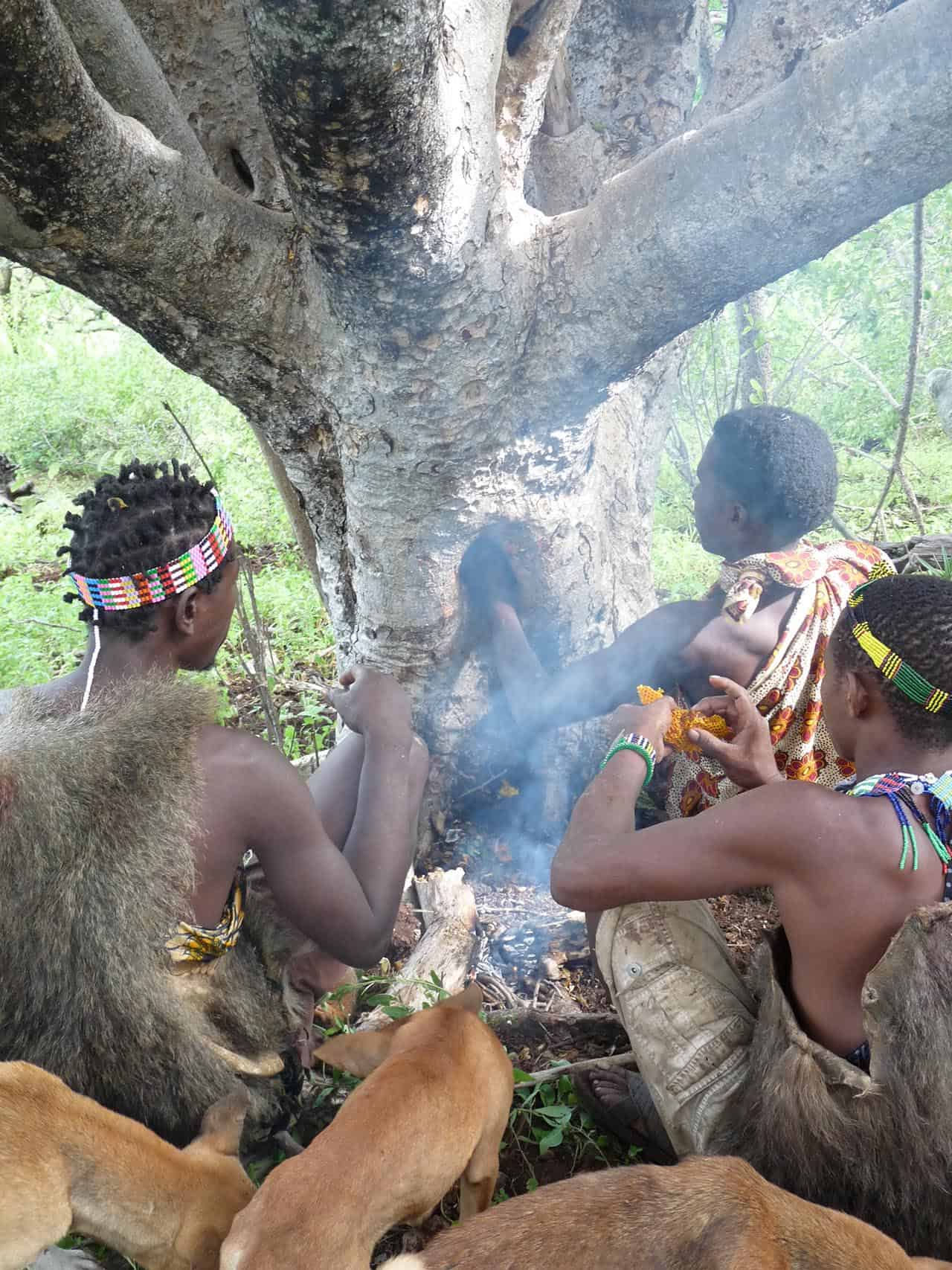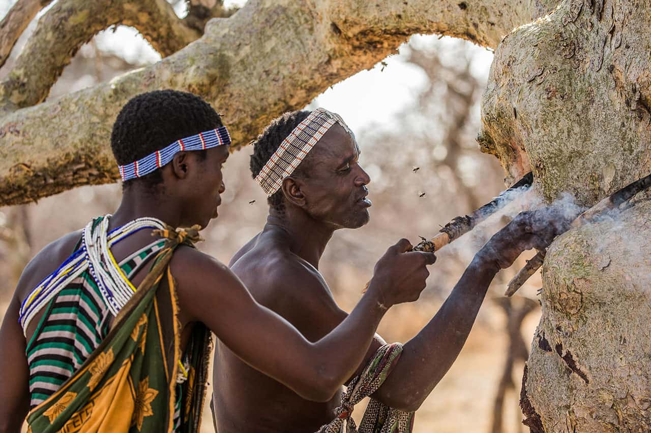 A partir de Karatu, entre le lac Manyara et le Ngorongoro, on peut se diriger vers l’Ouest et le lac Eyasi, non loin duquel habitent les Hadzabes ou Khoisans, des chasseurs cueilleurs issus du peuple originel qui existait avant l’arrivée des Bantous. Depuis, une autre tribu, les Datogas (pasteurs proches des masaïs) venant de la région du Ngorongoro, sont venus s’y installer. Les Hadzabes vivent toujours de manière traditionnelle. Ils ressemblent étrangement aux Bushmen du Kalahari (au Botswana, en Namibie et en Afrique du Sud) par leurs caractéristiques physiques (teint clair cuivré, yeux bridés, petite taille), par leur langue à clics et par leur mode de vie. Ils se nourrissent de baies sauvages, de racines et de gibiers qu’ils chassent à l’arc depuis toujours, avec des flèches empoisonnées. La chasse et la récolte de miel sont les activités des hommes, tandis que les femmes et les enfants récoltent fruits, graines et racines. Les Hadzabes habitent dans des huttes en terre battue ou parfois dans des grottes. Ils s’habillent toujours en peau de bête (impalas ou babouins) décorée de coquillages et se déplacent en fonction des zones de chasse et de cueillette.
