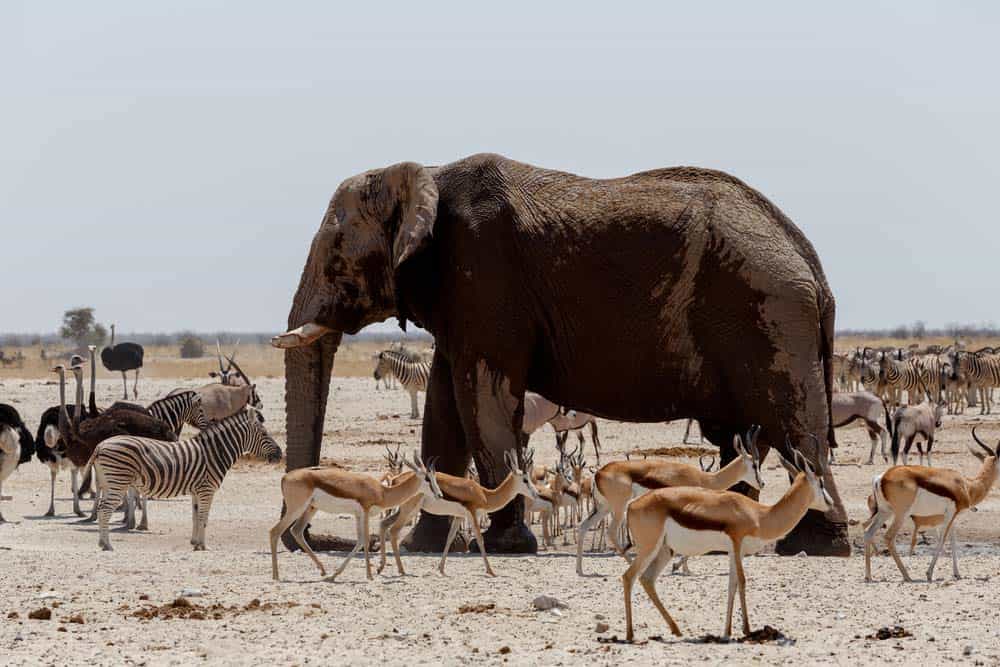La protection du parc ainsi que la présence de points d’eau en font un refuge pour nombre d’animaux que l’on peut contempler dans ces immenses plaines et zones de savane, de mopanes, d’acacias et de fascinants « ghost trees » : grands troupeaux d’éléphants, de zèbres de Bürchell, d’oryx, de springboks et de gnous, ainsi qu’une population importante de girafes, de hyènes brunes et tachetées, de lions, de lycaons (chiens sauvages), de guépards, de grands koudous, bubales, steenboks, dik-diks damaras, d’élands du Cap, de rares impalas à face noire, endémiques au nord-ouest de la Namibie, de léopards et de rhinocéros noirs et blancs que l’on peut généralement observer aux points d’eau.