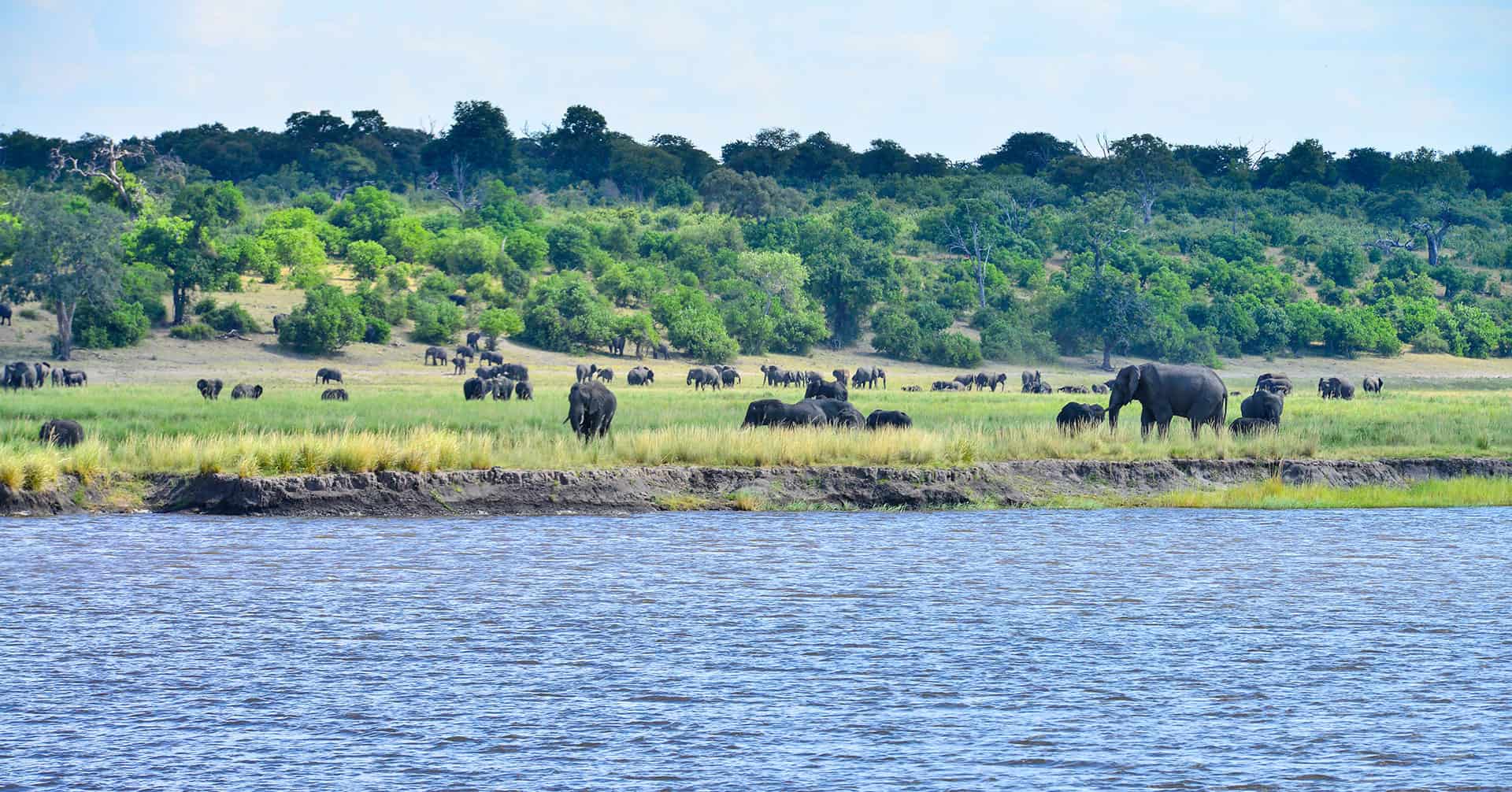 Le River Front surprend le voyageur par l’abondance de sa faune et l’exubérance de sa vie sauvage, particulièrement représentées par les éléphants, les hippopotames, les oiseaux et les reptiles aquatiques. Que ce soit en 4×4 ou en bateau, le spectacle de la vie sauvage est permanent. En fin de journée, surtout, nombre d’animaux sortent des forêts riveraines pour venir étancher leur soif au fleuve. C’est alors un spectacle des plus réjouissants dont le moment fort est toujours offert par les éléphants. Les pachydermes ne sont pas, cependant, les seuls mammifères observés. Une grande quantité d’antilopes est présente : parmi lesquelles les kudus, les cobes à croissant, les cobes Lechwe, les cobes des roseaux, les hippotragues noirs, les antilopes rouannes, les guibs harnachés et les pukus. Avec l’abondance des proies, les prédateurs ne sont pas en reste dans cette région (lions, hyènes ou léopards). Les babouins et les grivets sont présents, ainsi que des centaines d’espèces d’oiseaux (plus de 400 espèces différentes dont la diversité est liée à la grande variété des habitats : aigles pêcheurs, aigles martials, calaos, marabouts, vautours, martin-pêcheurs, aigrettes, oies, cormorans…).