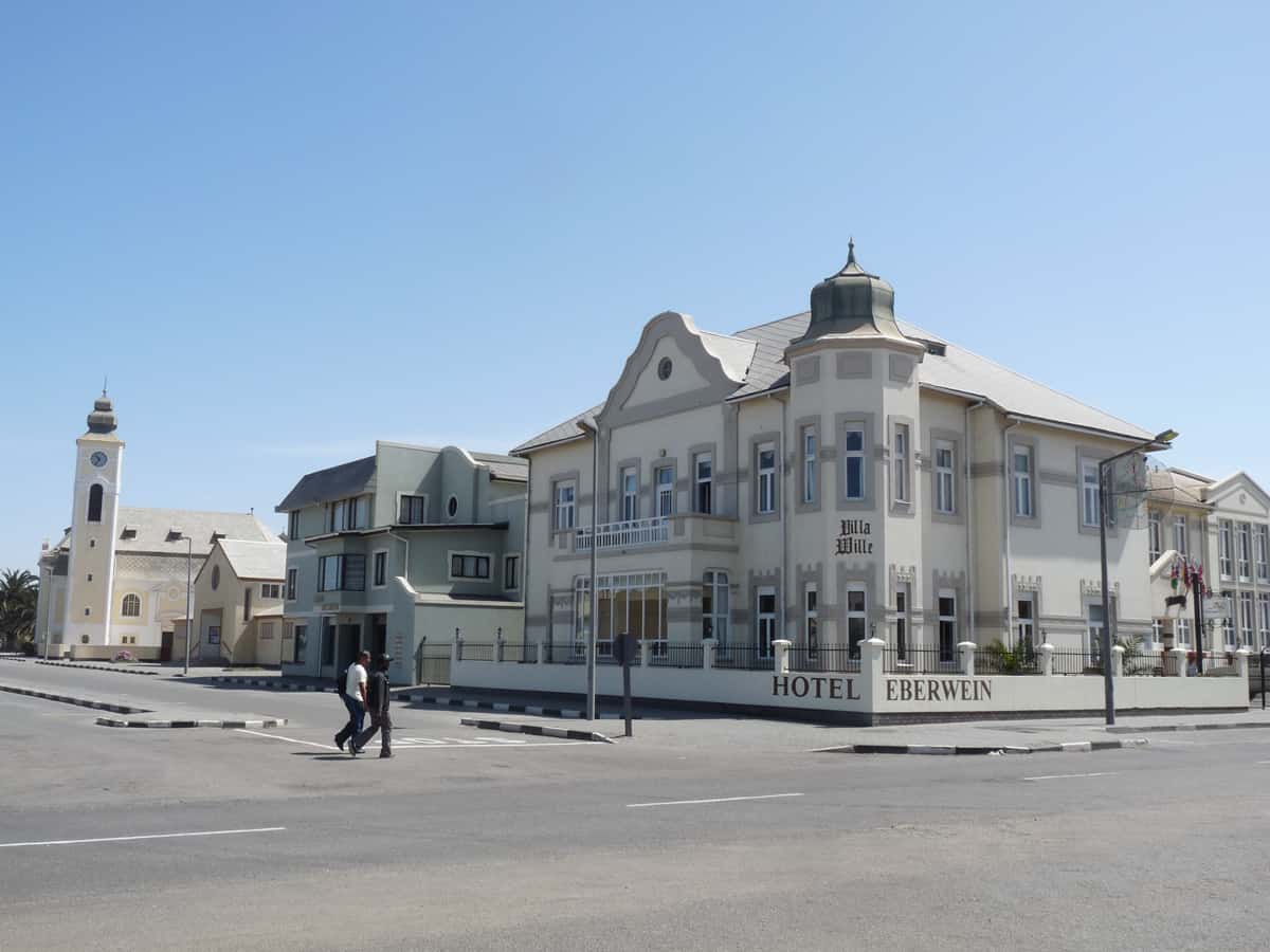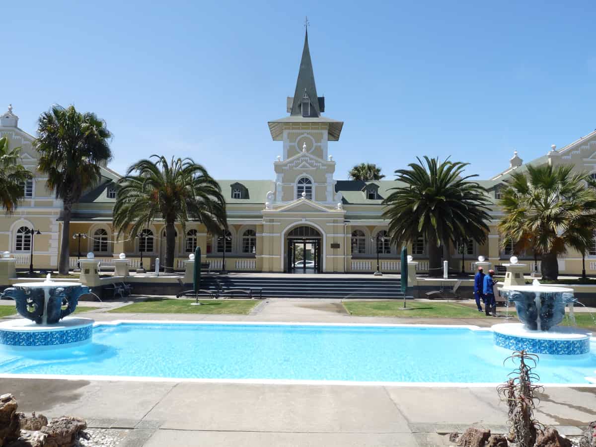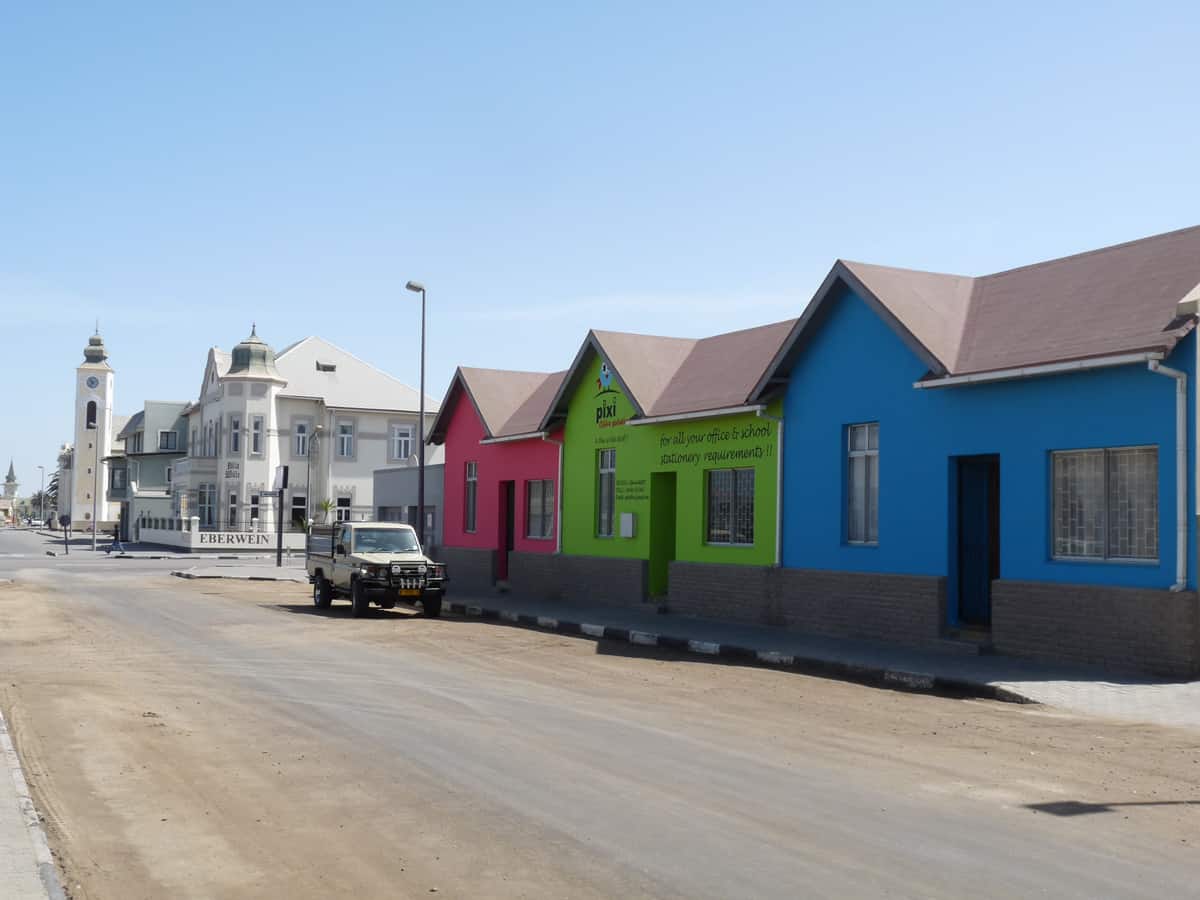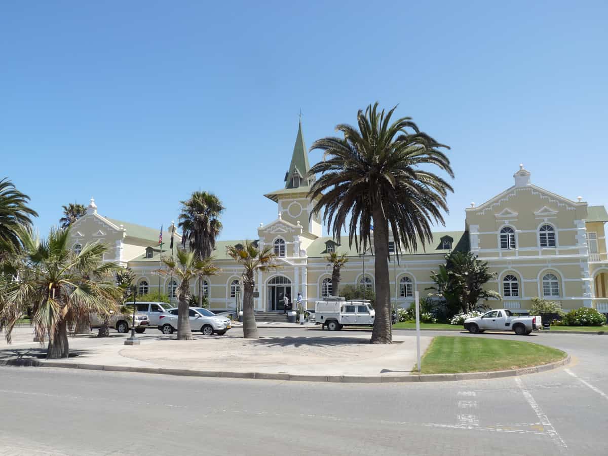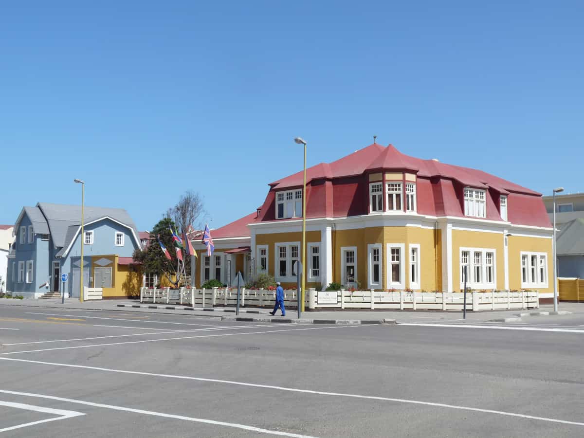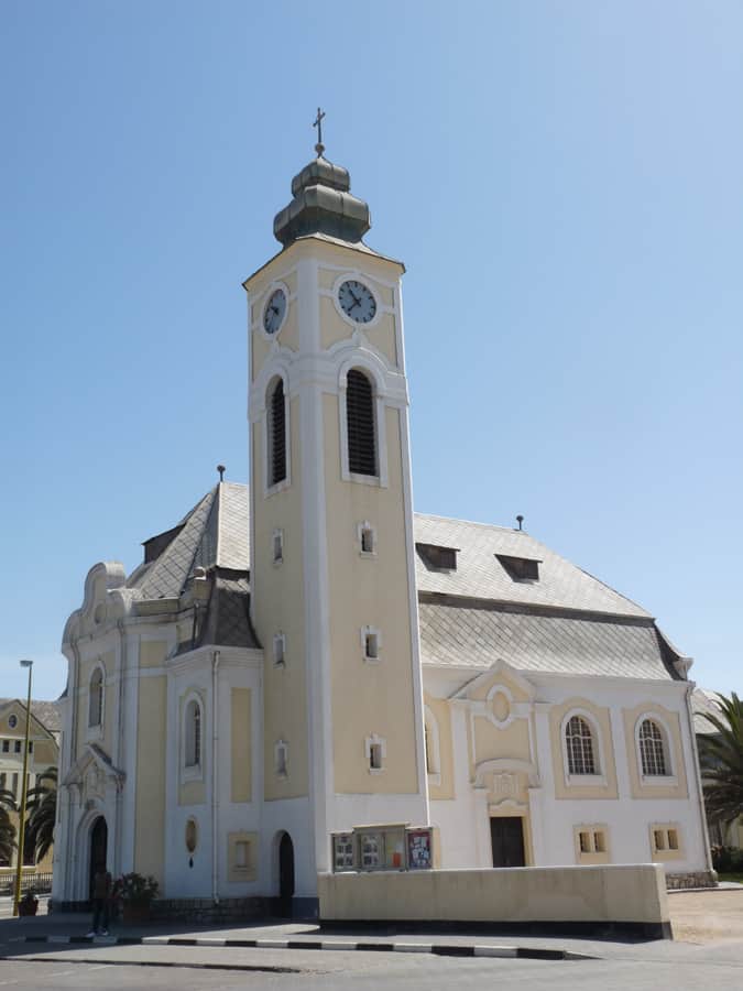 Fondée en 1892, par les colons allemands d’Afrique du Sud, Swakopmund est souvent décrite comme une ville provinciale allemande. Aujourd’hui, station balnéaire luxueuse pour les touristes européens et sud-africains, elle est un point de passage obligé entre les dunes du désert du Namib et la Skeleton Coast (côte des squelettes) vers le nord du pays. Après avoir traversé un désert sec et aride sur des centaines de kilomètres, Swakopmund apparait comme un véritable mirage. Entre pelouses vertes et jardins fleuris, les bâtiments modernes alternent avec l’architecture coloniale. La ville se prête peu à la baignade du fait d’une eau particulièrement froide (courant de Benguela) et de la présence de nombreux requins, tout au long de la côte namibienne. Une brume océanique, quasi quotidienne, venant du large, rajoute à l’ambiance du site, une note mystérieuse.